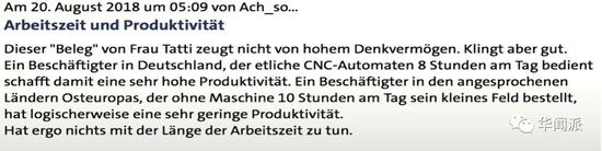 另一位网友也表示赞同:“塔蒂女士话说得太漂亮了,但是思维的漏洞已经填不满带不动了。试想一下,德国工人每天8小时动动手指头操控着CNC数控机床,东欧工人一整天全靠人力工作10小时,这可是攻击加成和徒手打怪的区别,已经不是时间来决定的了。”