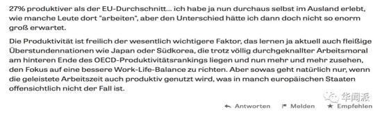 也有网友给出非常中肯的评价:“对于生产率高于欧盟水平27%我有话要说,我本身就在海外工作,并没有感觉到跟在德国工作有什么很大的区别,生产力是一个很关键的因素,如今像日本和韩国这样的发达国家,也几乎是疯狂的加班工作模式,够勤奋了,可是生产力水平仍是不理想,但他们已经意识到了要平衡工作与休闲时间。当然,劳动生产率越高,工作时间越短,这个前提是工作效率要达到很高的水平才可以实现,即使一些欧洲国家也没有做到。”