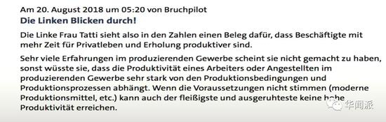 一位名为Bruchpilot的网友称:“这位女士可真是十指不沾阳春水,站着说话不腰疼,有点经验都会知道劳动生产率取决于生产条件和生产过程,如果条件不足,比如现代化生产方式,那你就是勤劳成小蜜蜂了也是于事无补。”