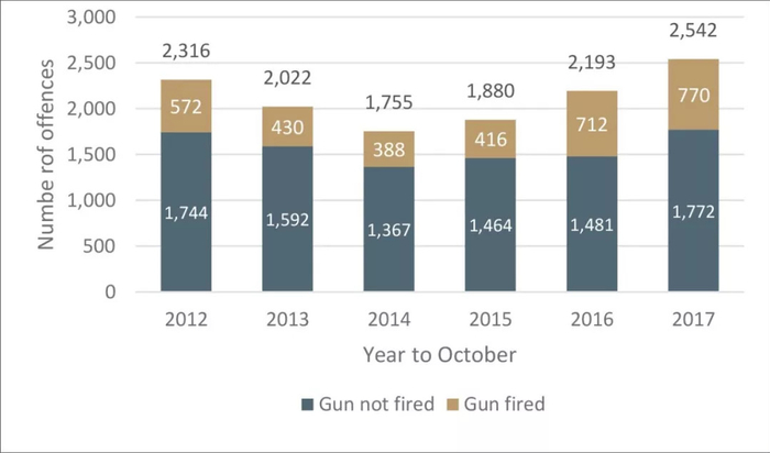 而就在今年一月,大伦敦议会(London Assembly)还刚发布了一则《伦敦枪支犯罪报告》。该机构在从伦敦警察厅获取相关数据后发出警告:过去三年来,伦敦范围内枪支犯罪案件数量持续上升,2017年比2014年高出了44.8%!