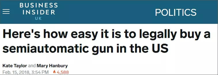 今年初美国佛罗里达州校园枪击案造成17人死亡再次震惊世界后,《商业内幕》英国版曾经写过这样一篇“科普”性质的文章,表示在美国的一部分州内,合法买枪只需要几分钟时间▼