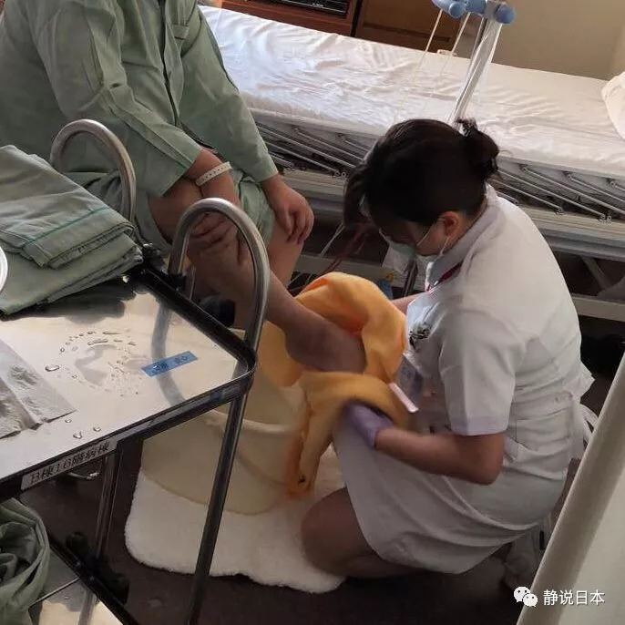 在日本的医院里,病人住院是不允许家属陪护的。病人的护理,包括上厕所、洗澡,全部由护士来完成。去年,我的一位北京朋友的父亲来日本旅游,突然摔了一跤,把手摔骨折了,他被送往医院治疗。因为骨折,自己不能洗澡。每天晚上,日本的女护士帮他脱光衣服,帮他洗澡。开始时候,他还感到特别难为情,后来,他只是一种感动,因为他的儿女都没有给他洗过澡。