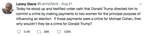 据Politico网站的Mariotti所言,让人吃惊的是科恩并没有被要求牵连特朗普以认罪。检察官准备的指控也没有包括特朗普指示了他的犯罪活动。因此科恩的意图是明显的:他想透露特朗普指示他犯罪,而指示别人犯罪亦是犯罪行为。21日当天,科恩的律师LannyDavis在推特上写道:“如果这些付款对科恩来说是犯罪,为什么它们不会成为特朗普的罪名?”这一说法也得到了康奈尔大学的法学教授Ohlin的支持:“特朗普显然犯了违反竞选财务法的罪行,也犯了联邦共谋罪(因为他同意了科恩——也许还有其他人——违反联邦法律的计划)”。