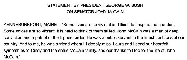 前总统小布什曾经在2000年总统大选中战胜麦凯恩成为共和党总统候选人,他发表声明称:“有些生命如此鲜活,难以相信他们已经逝去。有些声音如此富有朝气,难以相信它们已经平静……对我来说,他是我将深切缅怀的朋友。”