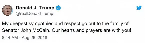 当麦凯恩决定放弃治疗,政界人士纷纷送上祝福时,白宫也一言未发。不过,在麦凯恩去世的消息公布后,特朗普还是迅速在推特上做出反应,但并非针对麦凯恩本人: