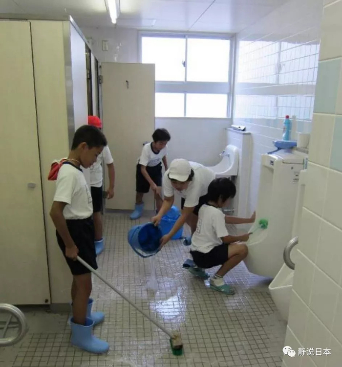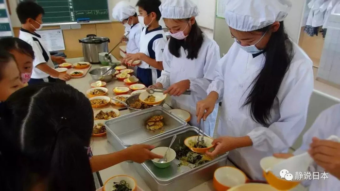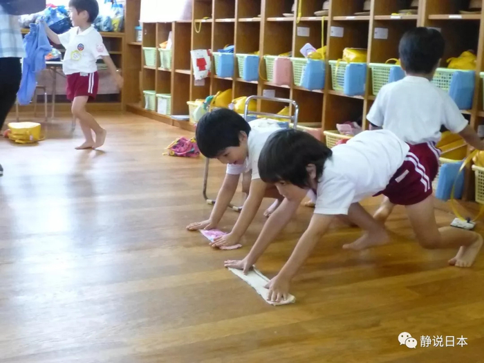 日本政府规定,小学生都必须在学校里吃午餐。但是这个午餐不是去食堂里吃,而是在教室里吃。值日生必须自己去食堂里把饭菜抬到教室里,然后分给每一位同学。而每一位同学吃完午餐后,必须做两件事:一件是自己把托盘和碗筷送到洗碗池里自己清洗干净,包括把牛奶纸盒拆开冲洗干净,然后把碗筷各自归类放好。第二件事,就是全体同学搬课桌,光着脚翘着屁股用毛巾手擦地板,把整个教室与走廊擦洗一遍。