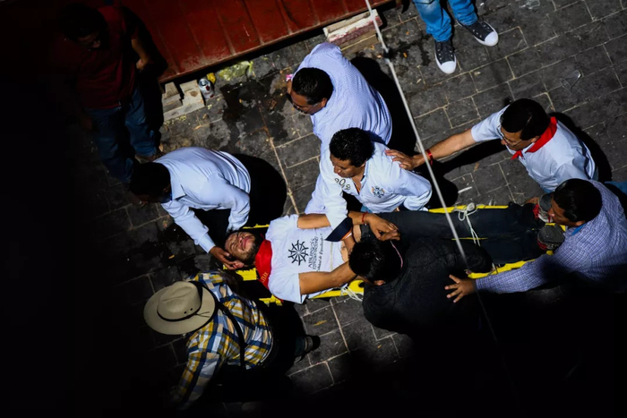 8月18日,在墨西哥特拉斯卡拉州瓦曼特拉小镇,一名男子遭公牛袭击后被送往医院。新华社记者辛悦卫 摄
