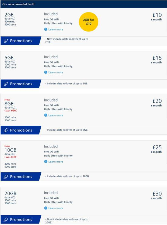 3)10镑的Pay As You Go月套餐包括500分钟通话和2GB流量5000条短信;现在的流量套餐比去年优惠太多,对于很多选择O2的小伙伴来说,这个10镑的套餐已经非常合适了。