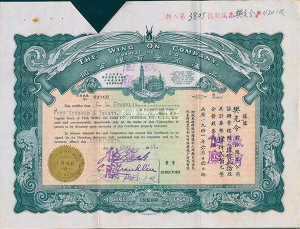 上海永安公司1941年颁发给樊克令的股东证
