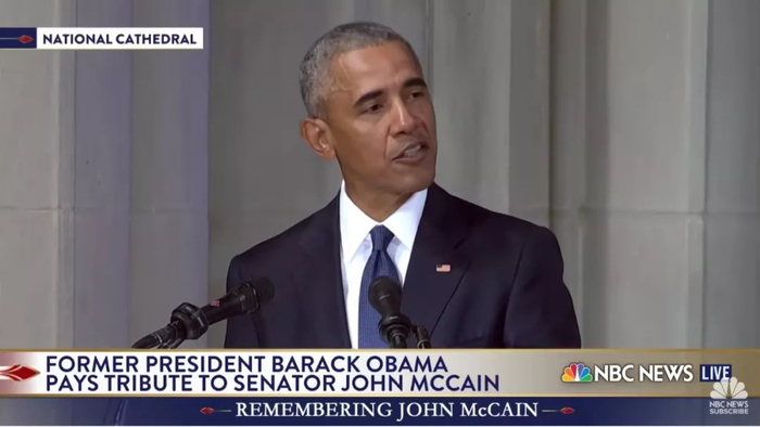 前总统奥巴马在约翰·麦凯恩参议员葬礼上致辞。(图片来自NBC News截屏)
