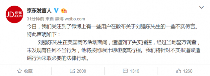 刘强东先生在美国商务活动期间,遭遇到了失实指控,经过当地警方调查,未发现有任何不当行为,他将按照原计划继续其行程。我们将针对不实报道或造谣行为釆取必要的法律行动。”