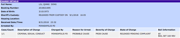 在明尼苏达州贺尼平县警察局的监狱名单网站查询会发现(https://www4.co.hennepin.mn.us/webbooking/chargedetail.asp?v_booknum=2018021695),有姓名为liu qiang dong 的案件信息,该刘姓人士的生日为1973年3月10日。他被指控为“犯罪性行为”(Criminal Sexual Conduct),于2018年8月31日 23:32被明尼苏达州警方逮捕,逮捕理由是有“合理依据”(probable cause)。