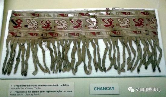 来自秘鲁钱凯文明带有鸟图案的纺织物,公元1200-1400年。