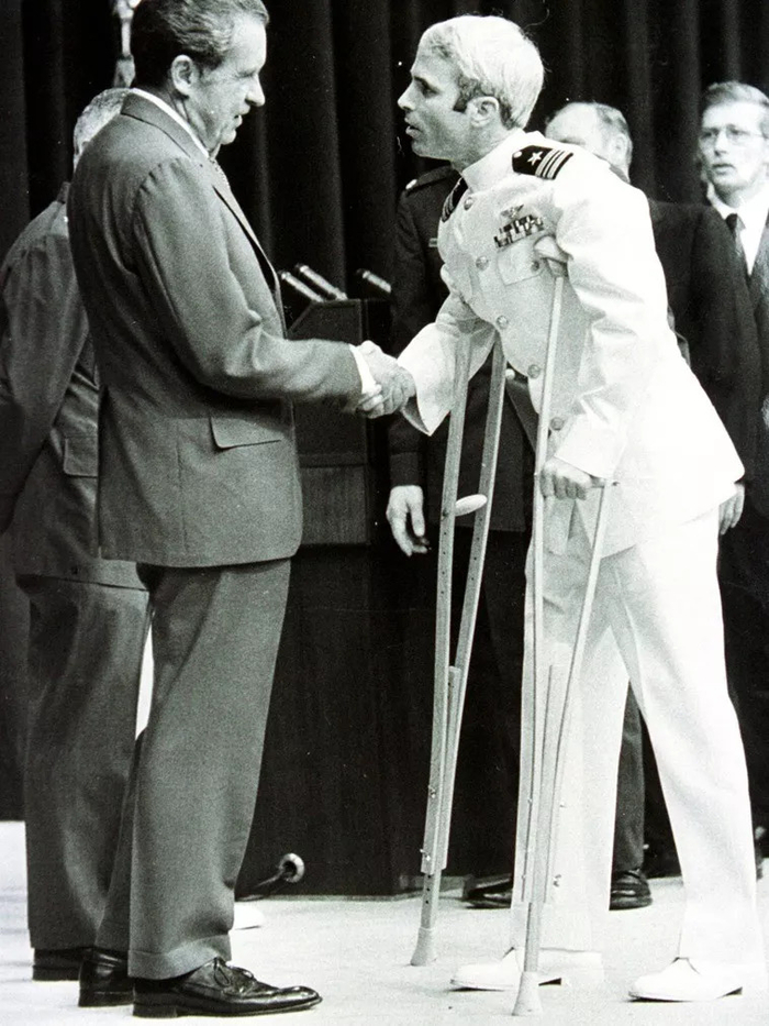 在白宫接待返乡战俘招待会上,麦凯恩拄着拐杖同尼克松总统握手的照片成为当时的标志性影像。