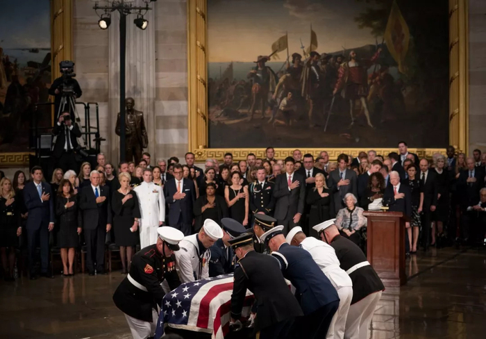 麦凯恩的灵柩8月31日停放于美国国会大厦圆形大厅供人们瞻仰,历史上仅有13位参议员有此殊荣。