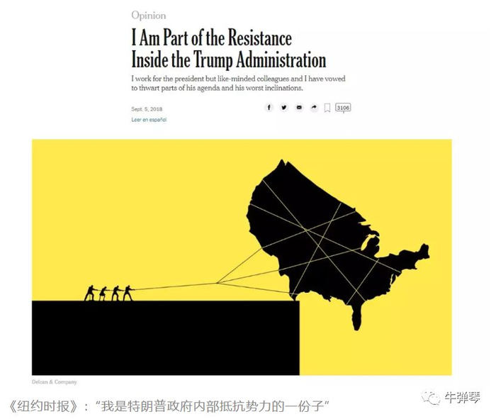 这篇文章的标题就是:“我是特朗普政府内部抵抗势力的一份子”。纽约时报还特别加了一个编者按: