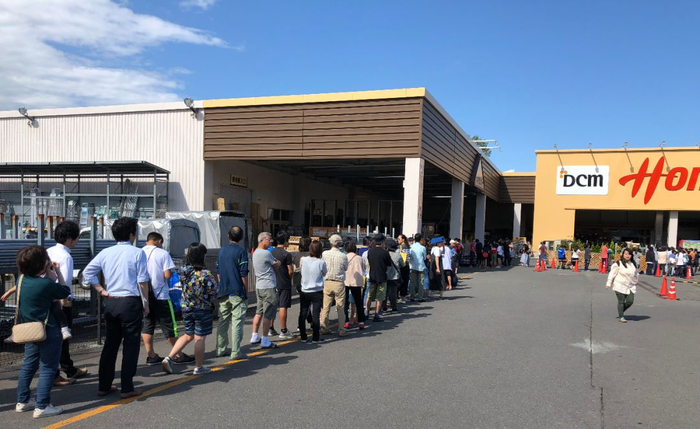 9月6日,在日本北海道伊达市,受地震和停电影响的当地居民排队购买物资。(新华社记者邓敏摄)
