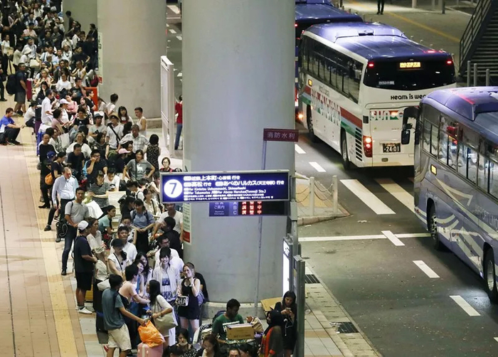 9月5日,在日本关西国际机场,旅客等候接驳巴士。新华社/共同社