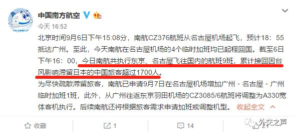 南方航空表示,9月6日当天,南航增加了从哈尔滨、沈阳、上海和广州四地飞往名古屋的临时航班。这些航班使用了座位更多的大机型,截至6日下午4点,南航共执行东京、名古屋飞往国内的航班9班,累计接回因台风影响滞留日本的中国旅客超过1700人。与此同时,南航也在申请9月7日在名古屋机场增加至广州的临时航班,后续还将根据旅客需求申请加班或调整机型。