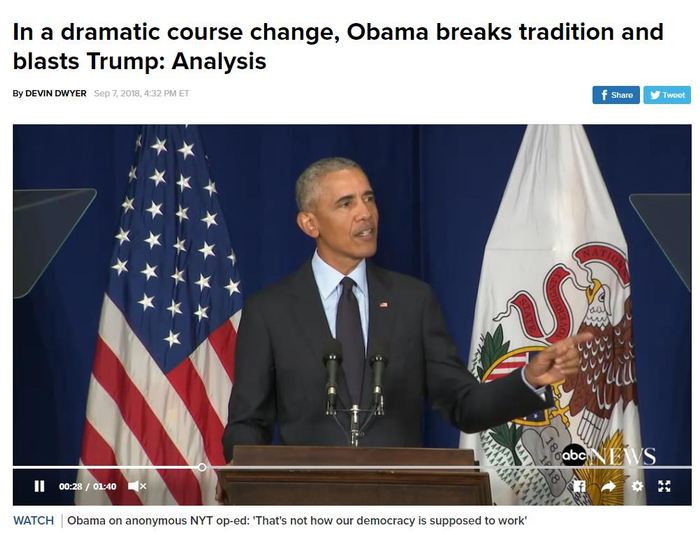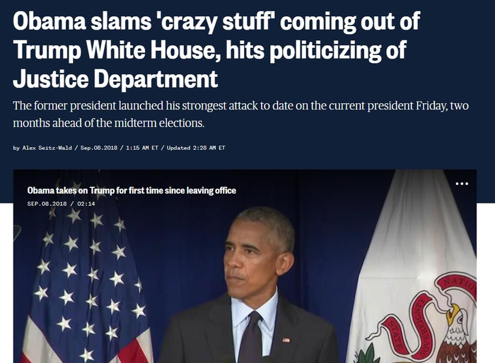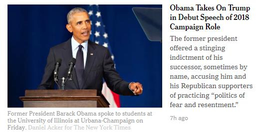 奥巴马的这次演讲迅速登上了美国各大媒体的头条,近期正因刊登匿名白宫官员批评特朗普文章而陷入话题中心的纽约时报,更是以“奥巴马叫板特朗普”为题发布了详细报道。