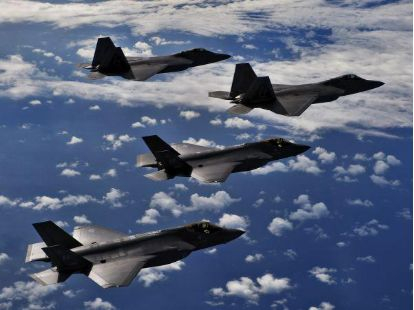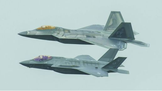 资料图片:美军F-22与F-35A隐身战机编队飞行