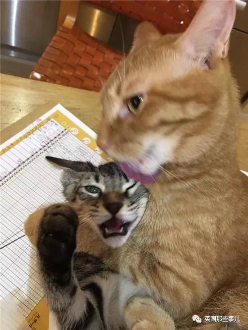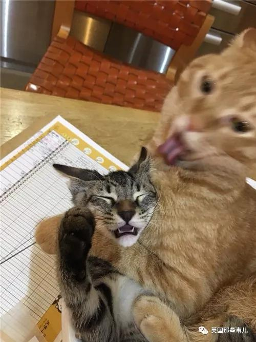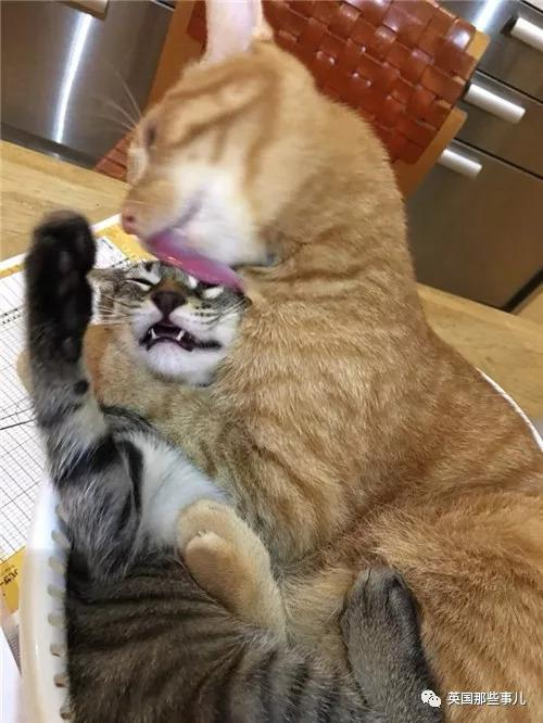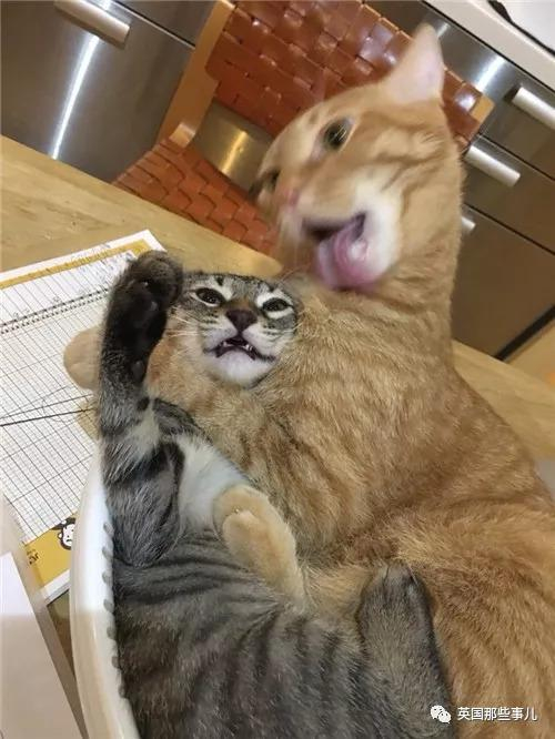 橘猫霸道总裁附体一般,搂住另一只狸花猫热情似火地舔,