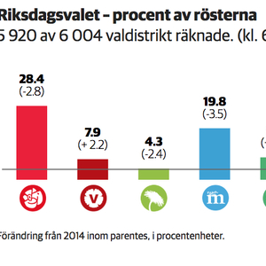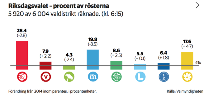据当地媒体报道,瑞典执政党社会民主党以28.4%的支持率领先,紧随其后的是温和联合党(19.8%)。极右翼瑞典民主党支持率为17.6%,超出上届大选5个百分点。
