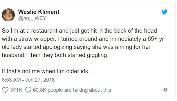 我在饭店吃饭时,后脑勺被一个吸管团打中了。我环顾四周,一个六十五岁左右的老奶奶立刻开始跟我不停道歉。“我本来是瞄准我丈夫的,但不小心打偏了。”