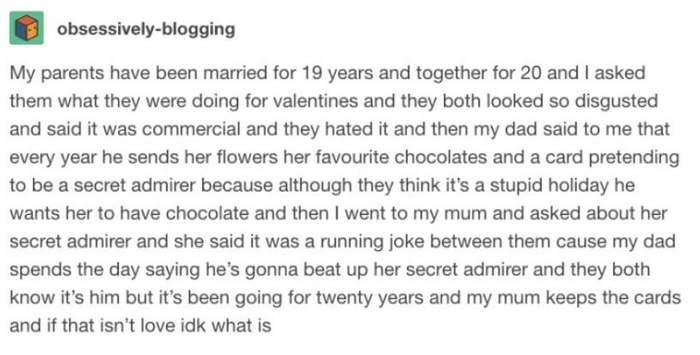 然后,我爸爸悄悄跟我说,每年他都会假装成一个匿名的爱慕者,给妈妈送她最喜欢的花朵、巧克力和小卡片……因为,他虽然觉得这个节日很蠢,但他还是想让妈妈收到礼物。