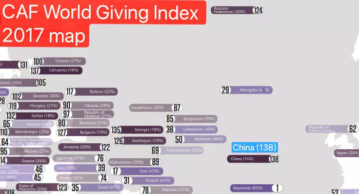 但是随着这些富豪们的不断崛起,与古训“穷则独善其身,达则兼济天下”相反的是,中国的慈善事业并没有因此迎来应有的春天。根据英国慈善基金会发布的《世界捐助指数》(CAF World Giving Index)可以看到,在全球139个国家中,中国人的捐赠指数占138名,位居全球倒数第二,倒数第一是也门。