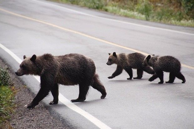 加拿大班夫国家公园,3只熊穿过马路
