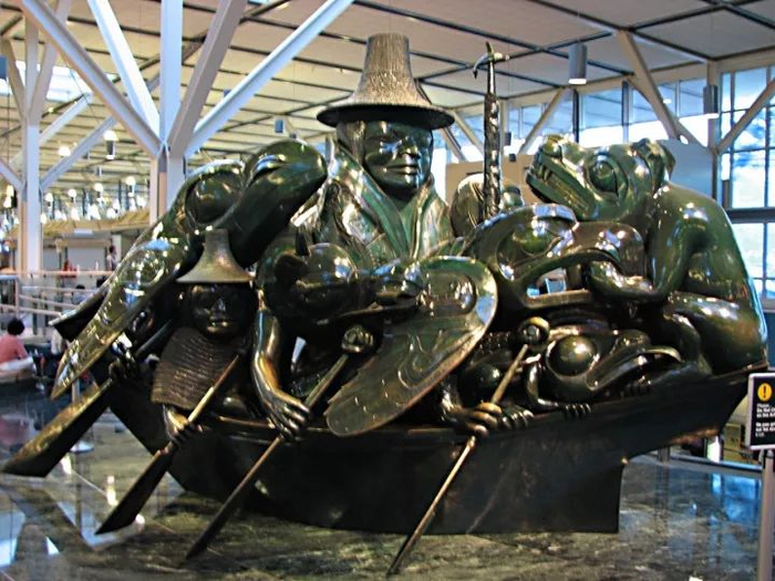 温哥华国际机场,安检口前摆着雕像“海达瓜依的精灵:碧玉独木舟”,这是加拿大艺术家比尔·瑞德(Bill Reid)的作品,熊、海狸、渡鸦、鹰、青蛙、逆戟鯨和巫师同坐一船。