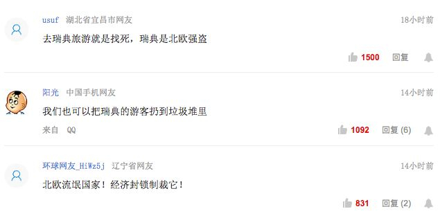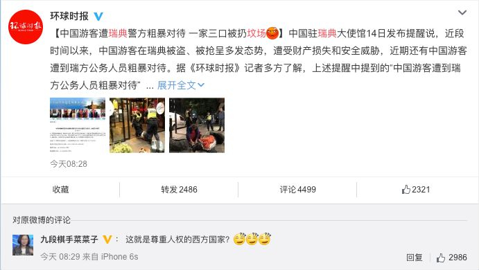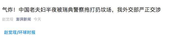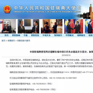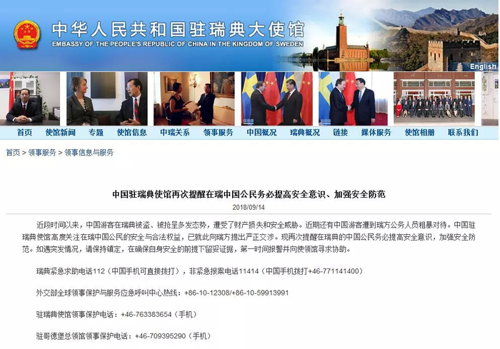 14日,环球时报报道近日有中国游客在瑞典遭到了当地旅馆和警察的粗暴对待,事件发生后我国大使馆还特意在官网贴出告示,要求中国游客注意人身安全。