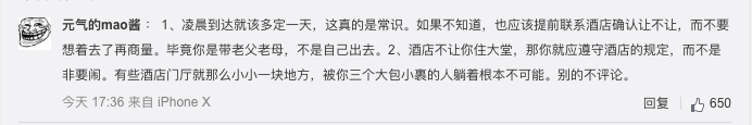 一方网友认为曾先生自己行程安排不妥,想占酒店便宜不成就撒泼耍赖,自身就有过错。