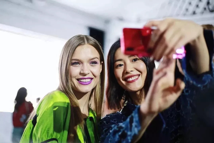 仔细看,会发现模特的胸前或背后挂着手机,这是 vivo 的新品机型 X23。