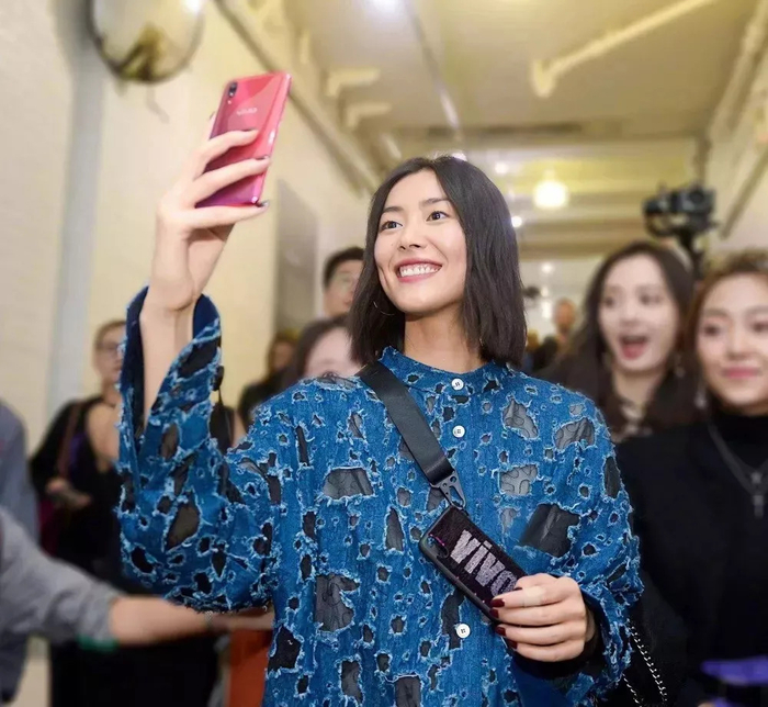 台下坐在第一排看展的刘雯,她刚刚在几个星期前正式成为 vivo X23 的代言人,你看她手里还拿着一部 X23。