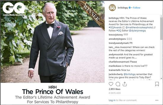 话要回到这个GQ男士年度斗艳大会,69岁的王储查尔斯认领了GQ男士的终身成就奖(Lifetime Achievement Award),王子还高高兴兴地准备了晚礼服。