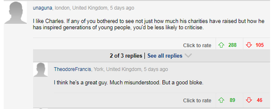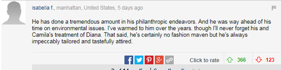“他为慈善事业作了大量努力,他在环境保护议题上有着领先的理念,这些年也让我觉得有点暖,当然我还是不会忘记他和卡米拉对戴安娜做的一切,我不觉得他是什么时尚专家,但他的穿着总能保持完美剪裁有有品位。”