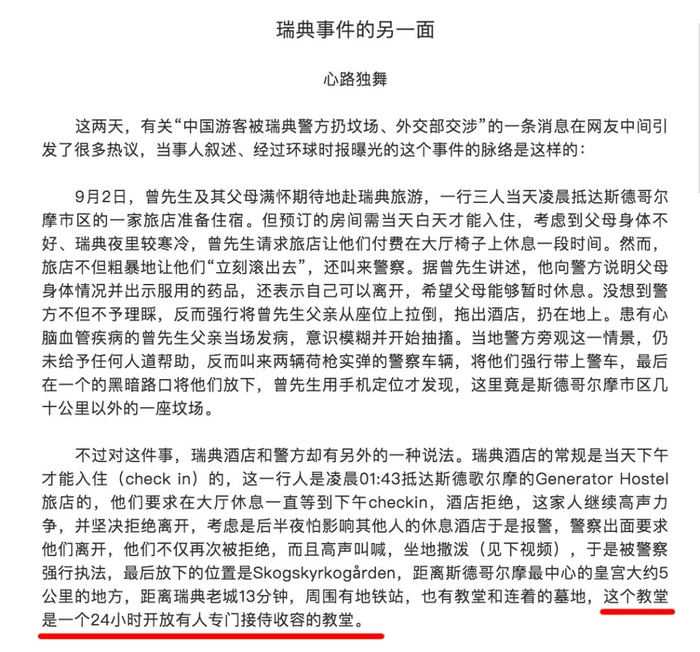 昨日起,网上也有理智的说法,认为事情主要出在中西文化差异和误会上。曾先生提出的让年迈父母在大堂留宿的要求,瑞典酒店难以接受,于是报警。曾先生一家拒绝离开,产生口角。这其中,曾先生称其父亲在被警察暴力拖拽时发病,意识模糊。其母为父亲喂药,急得坐在路边哭嚎。警方最终还是把他们带走,扔到位于斯德哥尔摩南郊的“林地公墓”。