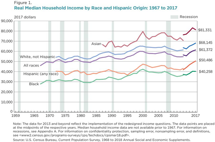 2016年至2017年间,非西班牙裔白人家庭(68145美元)和西班牙裔家庭(50486美元)的实际收入中位数分别增长2.6%和3.7%。这两个群体的家庭收入中位数第三年保持连续增长。在所有族群中,亚裔家庭2017年的收入中位数最高,为81331美元。