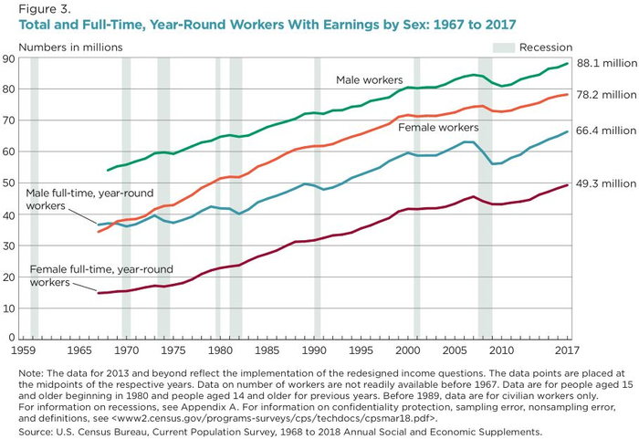 2016年至2017年间,全年全职工作的男女人数分别增加了140万和100万。