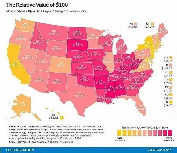 (100美元在每个州相对全国平均水平而言的实际价值,颜色越深、价值越高)