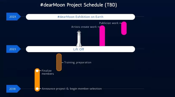 根据“亲爱的月亮”项目进度计划,2018年至2023年他将挑选和确定登机乘客,2023年发射火箭,艺术家会在太空就近距离看到月球的感受进行创作并发表作品。