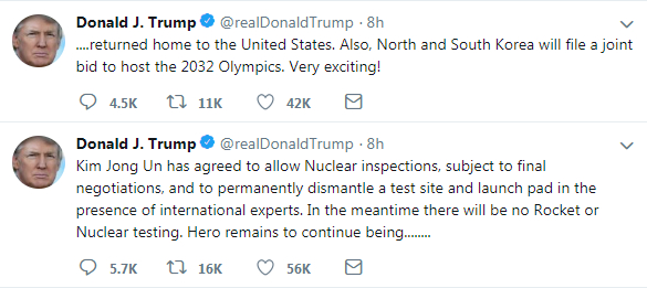 对此,18日深夜,特朗普还发推表示,“非常激动!”他写道,金正恩已同意对核武器进行查验并永久拆除试验场和发射台,与此同时,承诺不会进行火箭与核试验。