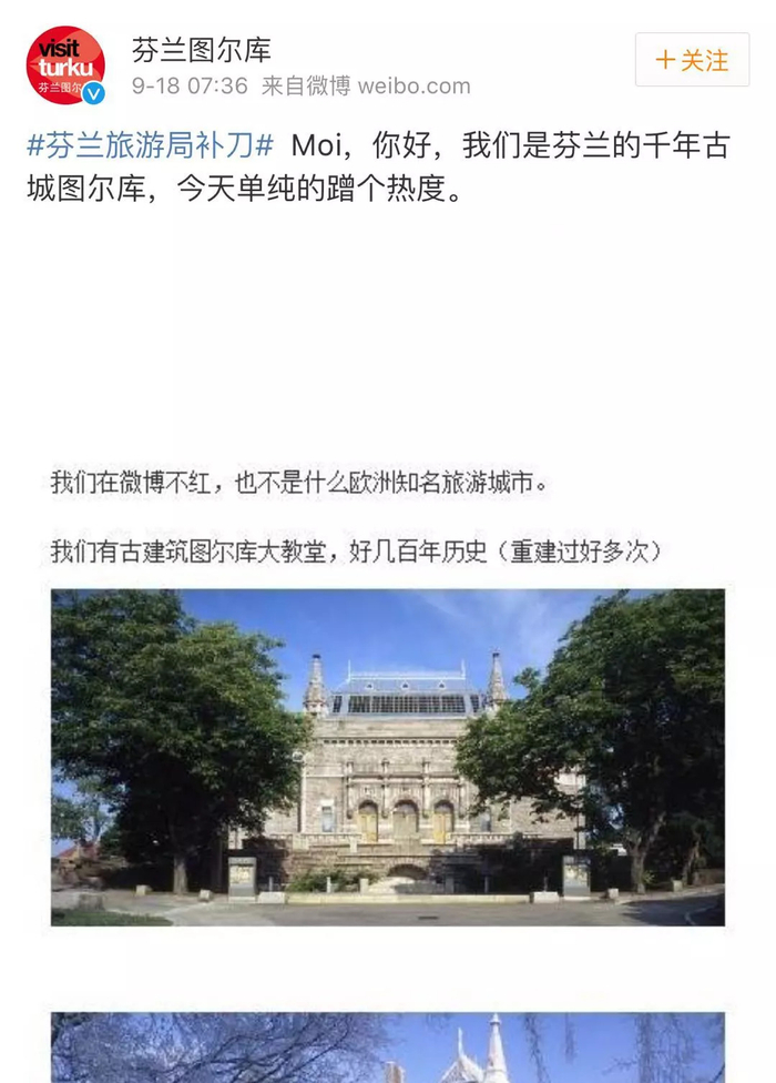 官微悄咪咪开始“抢生意”之后,芬兰其他城市的旅游局也不淡定了,暗斗不如明争,比如今天,图尔库旅游局就直接把“补刀”写进了微博话题里。
