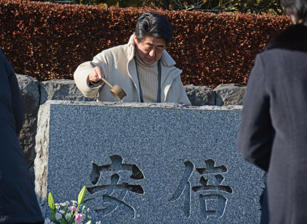 (安倍在外祖父和父亲墓前祭扫。岸信介的墓地在静冈县,安倍父亲则在静冈县和老家山口县均有墓地。)