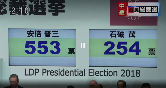 20日,安倍高票连任自民党总裁。当选举官员高声宣布计票结果时,台下的安倍看起来并无异常喜悦,他一脸严肃起身站立,在掌声和闪光灯中转圈、鞠躬致谢。