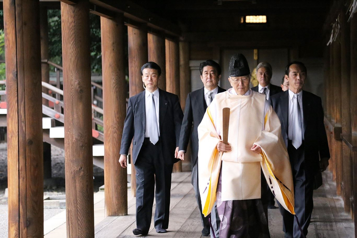 (2013年12月,安倍以首相身份参拜靖国神社。)