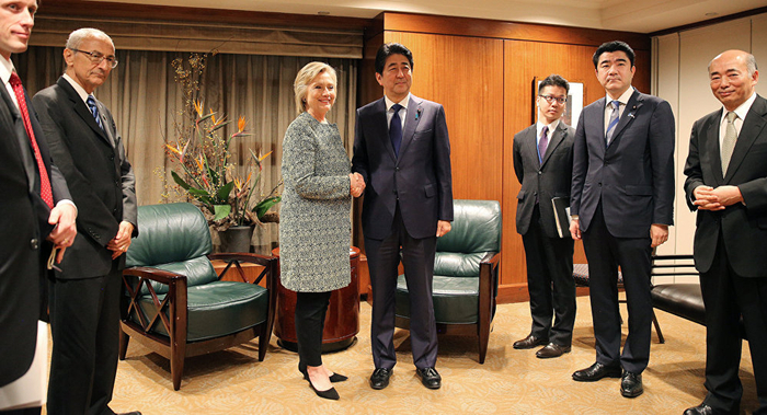 (2016年9月,安倍在美国大选之前意外站队,与希拉里见面。)