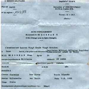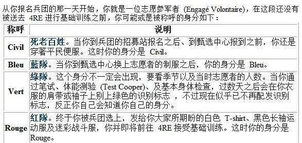 加入外籍军团总会遇到的步骤提交身份证明签约心理、智商测试身体检查体能测验犯罪记录调查与长官及安全单位面谈取得合约新兵训练军团成员以招募外籍人士为主,但法国公民仍可以(文书上的)外国人身份加入。外籍人士在服务满5年以后可以申请法国国籍,在确认受到足够同化后便可取得国籍。不愿意放弃原有国籍者,在契约结束后也可以得到法国居留权。如果你认为在你未来生命中的某一天你可能会把加入外籍兵团当做是你生涯规划的一部分,那么……首先你一定要是男性。你会在来到甄选中心的前一天签下你与外籍兵团的五年合约,并且从那天开始计薪。不过在你签字的时候,你是没有时间来仔细看看这份合约的。不过这份合约也没有什么不公平的地方,重点只在于有六个月的试用期,在这段试用期之中双方都可以终止这份合约。而且这份合约是用你的假名签下来的,所以这份合约基本上跟废物没有什么区别虽然你签下了这份合约,但你要到前往Castelnaudary 4RE接受基础训练的前一天,才能在兵团的荣誉殿堂中取回你的那一份合约。